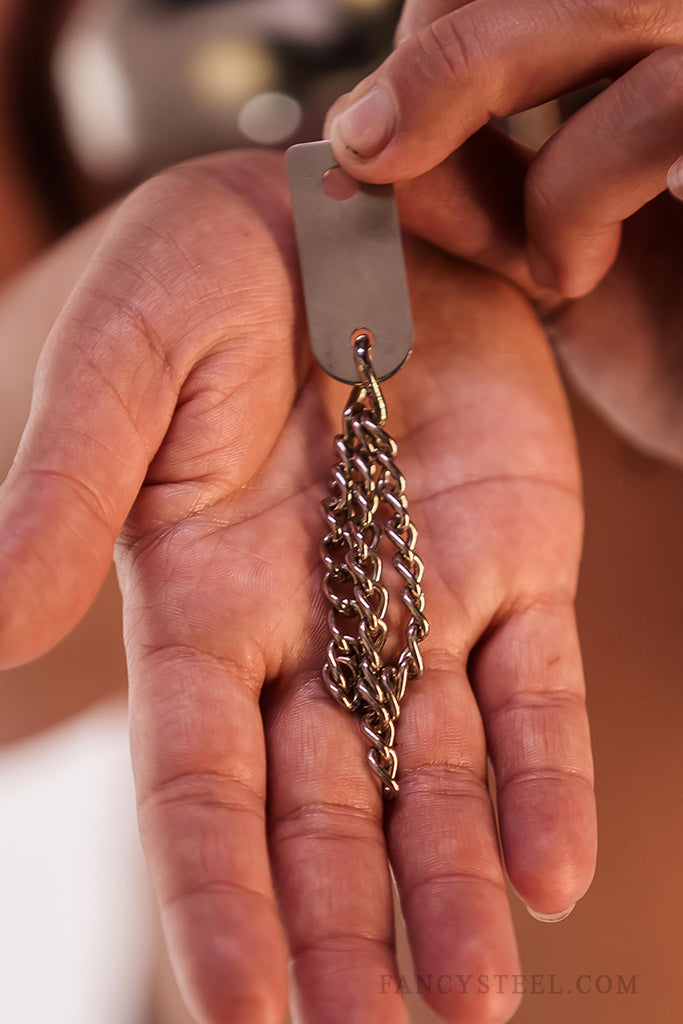 A chain of precision-cut steel links hangs inside the chastity shield.